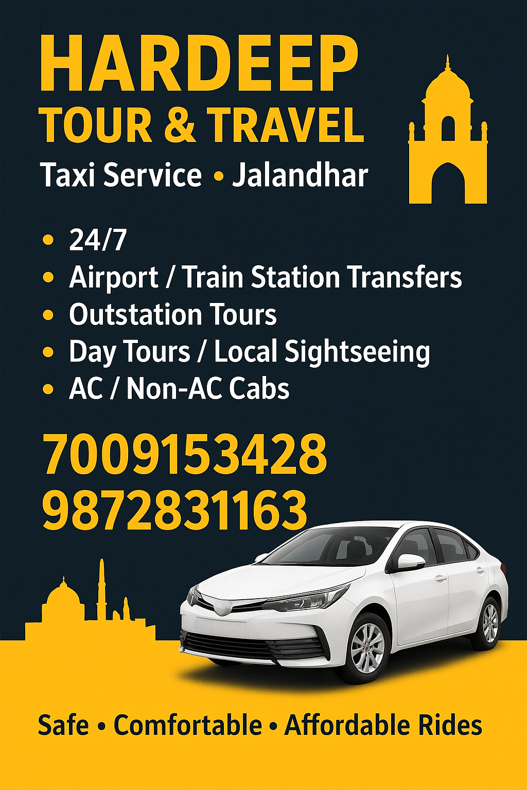Hardeep Tour & Travel is your trusted partner for reliable taxi service and tour operations in Jalandhar and throughout Punjab. I offer top-quality one-way, outstation cabs and airport taxi service to Delhi, Amritsar, Chandigarh, ensuring safe and comfortable travels. I understand your priorities; I provide transparent pricing and a range of well-maintained cars to suit your needs. What sets me apart is my commitment to punctuality and customer satisfaction, round the clock. For the best trip available, choose Hardeep Tour & Travel. Request a quote today—I am here to get you where you need to be!